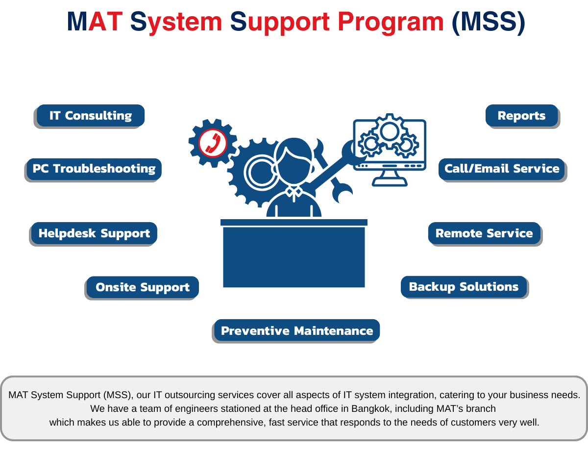 MATはシステムインテグレーターならびにテクノロジー革新者として30年以上の経験で業界をリードしており、ITアウトソーシングサービスやMAT システム サポート (MSS) などのお客様のご要望に応じたシステム構築サービスをご提供させて頂いております。